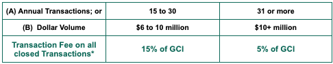 (ii) Transaction Fees. As compensation for Lever’s providing the Lever Services to Participating Agent, in the event that any Participating Agent client (“Client”) (i) closes on the purchase, sale, purchase and sale or lease of residential real estate during the Term or (ii) enters into a contract for the purchase, sale, purchase and sale or lease of residential real estate during the Term, even if such closing occurs after the end of the Term (a “Transaction”), then Participating Agent will pay to Lever a fee (the “Transaction Fee”) equal to the Transaction Fee Percentage (as defined below) of the Gross Commissions (as defined below) on all such Transactions. Also for the avoidance of doubt: (a) a single closed real estate transaction can include both the buy-side and sell-side, and in such cases the Transaction Fee shall be due and payable from each side of a Transaction. “Gross Commission” is the gross amount that your broker/brokerage is eligible to receive from a Participating Agent client’s Transaction as stated in the closing statement or lease agreement(s) for such Transaction, including any bonuses paid to an agent for client-side real estate brokerage services and real estate agency services of any and all real estate transactions (including subsequent lease commissions on a property purchased or sold); provided that, if you close a Transaction via a referral to you where you owe a referral fee to a third-party, Gross Commission will be reduced by such third-party referral fee. The “Transaction Fee Percentage” is 20%; provided, that, the Transaction Fee Percentage shall be reduced if Participating Agent achieves, in a 12-month period, either of the following (a) transaction number or (b) transaction volume (based on closing price) targets: